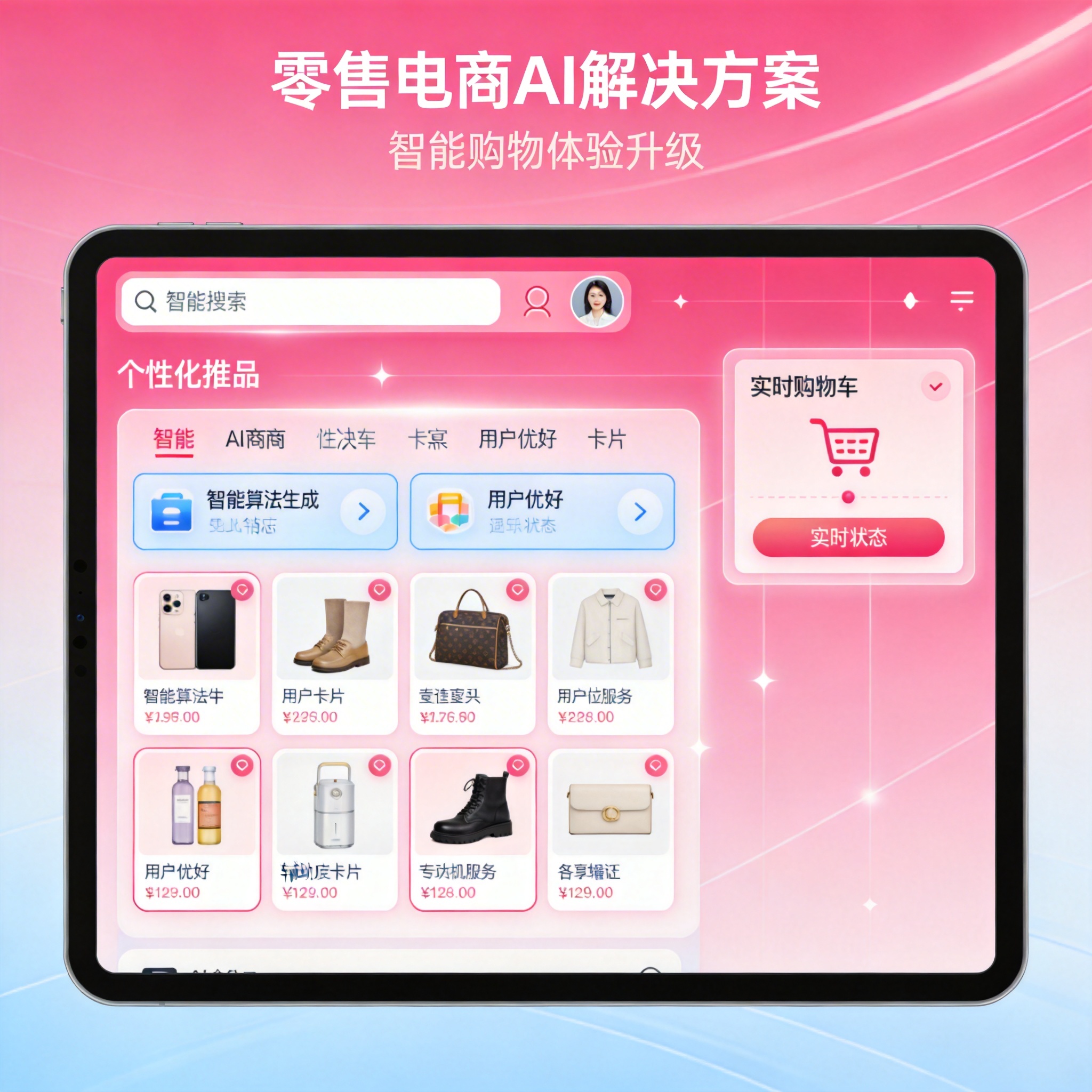 基于用户行为分析、机器学习和推荐算法为电商平台提供全方位智能化服务,个性化推荐系统精准推荐用户感兴趣商品提高转化率和客单价,智能库存管理通过销售预测优化库存配置减少积压,客户行为分析深度挖掘用户偏好支持精准营销,销售预测准确预测销售情况帮助制定采购计划,价格优化动态调整商品价格实现利润最大化,智能客服支持多轮对话提供高质量服务,促销策略智能制定营销活动,商品搜索提供精准快速的搜索体验,订单处理自动化提升发货效率,用户画像构建全面的客户画像。